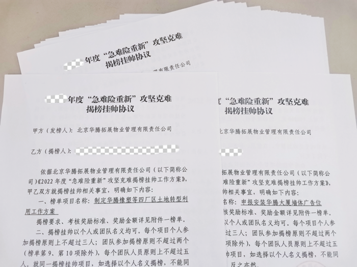 在華騰拓展年初開展的急難險(xiǎn)重新“揭榜掛帥”活動(dòng)中,華騰大廈團(tuán)隊(duì)所揭的榜,直指大廈寫字樓經(jīng)營開發(fā)的“痛點(diǎn)”“難點(diǎn)”。面對(duì)任務(wù)明確、目標(biāo)清晰的榜單,這個(gè)團(tuán)隊(duì)心中有壓力,但更有干勁兒和沖勁兒。“好像前面有一座堡壘,你的任務(wù)就是攻下它!”大廈員工說,“我們得想辦法,老辦法不成,就得想新辦法、出新招,現(xiàn)在我們都在圍繞揭榜轉(zhuǎn),團(tuán)隊(duì)的積極性都給調(diào)動(dòng)起來了。”